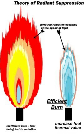 incomplete combustion as a result of heat and the existence of free oxygen radicals. While nitrogen is not necessary for combustion to take place, 78% of the atmosphere is made of this element. The atmosphere also contains 21% oxygen, which is used as the oxidizer in the combustion process. If you look at all the test performed on our additives related to flue gases or exhaust gases you would see a steady pattern of overall reductions in CO, VOCs and NOx. This means that relatively more of the fuel is being consumed, less is converted into air pollution, and that the combustion chamber is running cooler, as shown by the reduction in NOx. Why? Few people on this earth really understand combustion. So many things happen in such a short period of time that some are still not fully understood. One thing is for sure - if more of the fuel is consumed and converted into heat, less escapes as radiant heat (radiant heat is energy transmitted by radiation. These rays proceed directly away from the heat source like light rays from the sun). This is the theory of radiant containment. When the hydrogen-carbon based fuel is mixed with oxygen and ignited a flame is formed. The EF Fuel Additive technology causes a water barrier to form on the outside of the flame wall because of the effect EF has on the host fuel. This prevents heat from escaping, or going to waste, and causes the internal flame temperature to go up - thermal value is increased. The center of the flame is hotter and the outside is cooler. Less "heat," the driving force of the fuel is lost as radiant energy. |